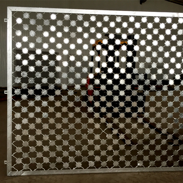 1、 梅花刺片護(hù)欄網(wǎng) 又名太陽(yáng)花刺片隔離網(wǎng),為單層梅花刺片網(wǎng),直徑不小于75cm,刺片厚1.5mm,采用Q 235低碳鋼板沖壓成型。 2、網(wǎng)片為菱形網(wǎng)孔,網(wǎng)格尺寸∶120mm*110mm(…
