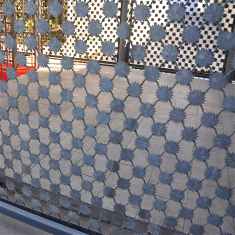 1、梅花刺片:梅花刺片直徑不小于7.5cm(直徑6cm、7cm、8cm),刺片厚1.5mm,采用Q235低碳鋼板沖壓成型。梅花刺片用氬弧焊將梅花形刺片焊接在美格網(wǎng)的節(jié)點上,形成刺形保護,有效的防止了手握腳攀。
