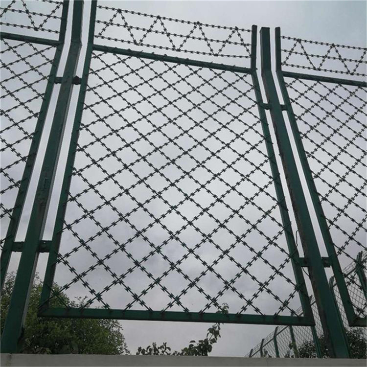 5. 監(jiān)獄鋼網(wǎng)墻頂部防攀爬刀片滾網(wǎng)、拉絲、卡扣,均采用不銹鋼材質。刀刺網(wǎng)安裝固定卡扣整體調正,使刀刺網(wǎng)不出現(xiàn)擰轉情況,刀刺刺圈分布均勻,每隔30-40cm與拉絲固定;段連接處需將兩端刀刺網(wǎng)做連接固定,刀刺網(wǎng)固定點需緊鎖不得出現(xiàn)松動、脫落現(xiàn)象;刀刺網(wǎng)安裝與隔離網(wǎng)平行,上下左右均成直線延伸,轉角處需做加密加固處理。