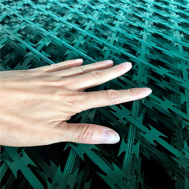 特點:焊接刀片刺網(wǎng)又名菱形刀刺網(wǎng),是一種近年發(fā)展起來的防護、隔離能力較強的新型防護網(wǎng)產(chǎn)品。它采用鋼板沖壓成型包附于鋼絲(筋絲)之上,由銳利尖角鍍鋅鋼板或不銹鋼薄板做刀片,高張力鋼絲做芯線組合而成的。鋒利的刀型刺由雙線扣裝后成蛇腹狀,既美觀又讓人不寒而栗。起到了很好的阻嚇作用。
