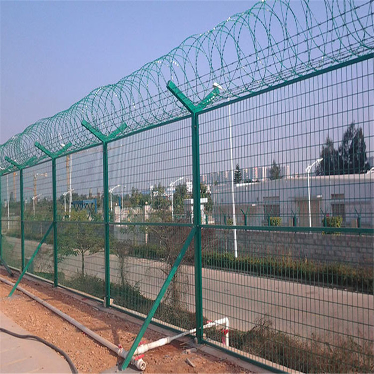 機場圍界頂部加裝刀片刺絲、刀片刺網(wǎng)后又很好的增強了安全防護性能。采用電鍍、熱鍍、噴塑、浸塑等防腐形式,具有很好的抗老化、抗曬、耐腐蝕等特點。其產(chǎn)品造型美觀、花色多樣,既起到圍欄作用,又起到美化作用。由于具有安全性高、防攀爬能力好,網(wǎng)片連接方式采用特制SBS緊扣件,有效防止人為的破壞性拆卸,橫向四道折彎加強筋,使網(wǎng)面強度顯著增加。