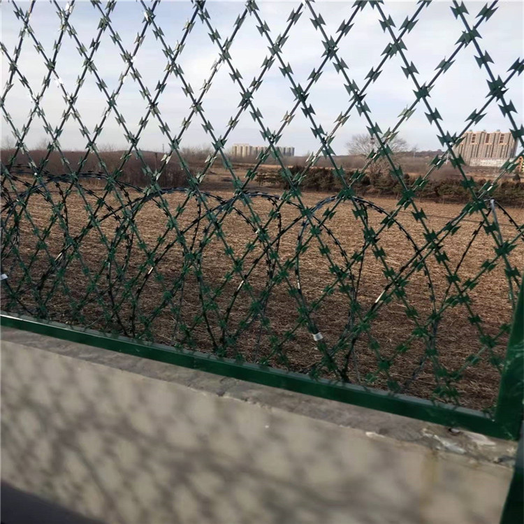 蛇腹式刀刺網(wǎng)材料有中碳鋼絲、冷軋鍍鋅薄板,不銹鋼板,不銹鋼絲。蛇腹型刀片刺網(wǎng),上、下部懸掛0.5米的交叉蛇腹型刀片刺網(wǎng),刀片刺網(wǎng)采用鋼板沖壓成型包附于鋼絲(筋絲)之上,由銳利尖角鍍鋅鋼板或不銹鋼薄板做刀片,高張力鋼絲做芯線組合而成的。鋒利的刀型刺由雙線扣裝后成蛇腹狀,既美觀又讓人不寒而粟。起到了很好的阻嚇作用。刀片刺網(wǎng)硬度好,