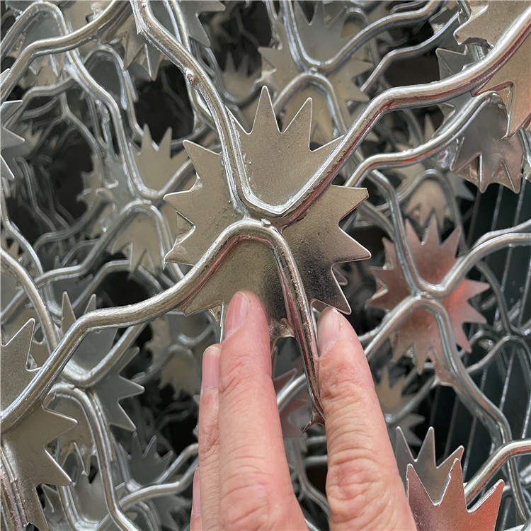 梅花刺隔離網(wǎng)是由V型支架立柱,加強(qiáng)型焊接片網(wǎng),安全防盜連接件和熱鍍鋅刀片刺籠組成強(qiáng)度和安全防護(hù)。地等高安全場所。高碳鋼絲、鍍鋅絲,不銹鋼絲,鋁合金編焊而成;堅(jiān)固、不生銹、美觀大方。