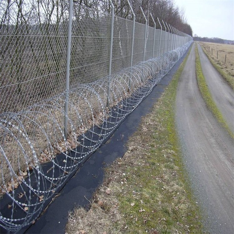 3、鍍鋅刺刀圈材料及安裝技術(shù)要求:鍍鋅刺刀圈材料:常用刀片刺網(wǎng)規(guī)格為BTO-22,刺圈直徑500mm,刀片長(zhǎng)度22mm,刀片寬度15mm,刀片間距34mm,鍍鋅噴塑。鍍鋅刺刀圈規(guī)格為雙股2mm鐵絲捻扎而成,刺結(jié)間距102mm,鍍鋅防腐。鍍鋅刺刀圈安裝應(yīng)控制在每米圍界范圍內(nèi)有5個(gè)刺圈,即刺圈安裝間距20Omm,要求刀刺圈間距均勻,上下口平直。刺刀圈固定件為專用卡扣,使用專用工具固定在鋼圍界刺繩上,卡扣不得有松動(dòng)現(xiàn)象,保證刺網(wǎng)安裝牢固。