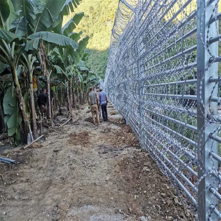 螺旋圈狀刀刺網(wǎng)主要利用其獨(dú)特的形狀和材料特性來(lái)阻止罪犯的入侵和逃脫。這種刀刺網(wǎng)通常由高強(qiáng)度材料制成,如不銹鋼、高強(qiáng)度聚合物等,具有極高的抗拉性能和刀片般的銳利邊緣。當(dāng)罪犯接觸到刀刺網(wǎng)時(shí),其銳利的邊緣會(huì)對(duì)其造成嚴(yán)重的切割傷害,使得罪犯不敢輕易攀爬或穿透