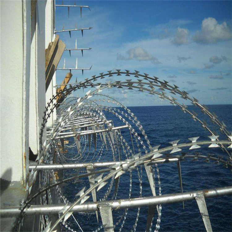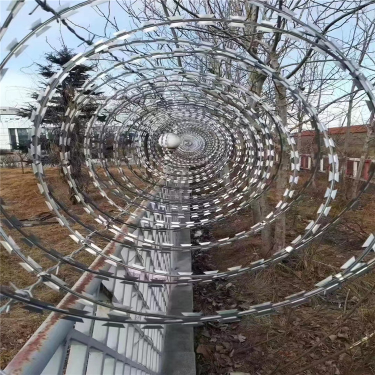 不銹鋼刀片刺繩可防盜色澤潔白發(fā)亮,鋅層厚、刀片分布均勻、刀片鋒利不易產(chǎn)品特點(diǎn):生銹、牢固耐用低碳鋼絲、焊點(diǎn)抗拉力強(qiáng)、支撐力大抗拉力強(qiáng)、使用壽命長(zhǎng)可廣泛用于許多學(xué)校、小區(qū)、家用、園林公寓、邊防。