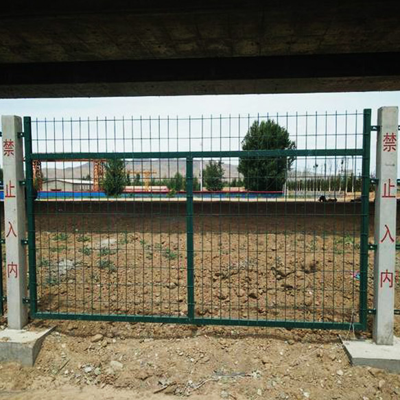 鋼筋混凝土立柱金屬網(wǎng)片防護(hù)柵欄可采用單開門或雙開門兩種形式。單開寬度1.5m,雙開寬度3m,其網(wǎng)片形式與防護(hù)柵欄保持一致,并通過銷鈾、銷鈾套與立柱連接。